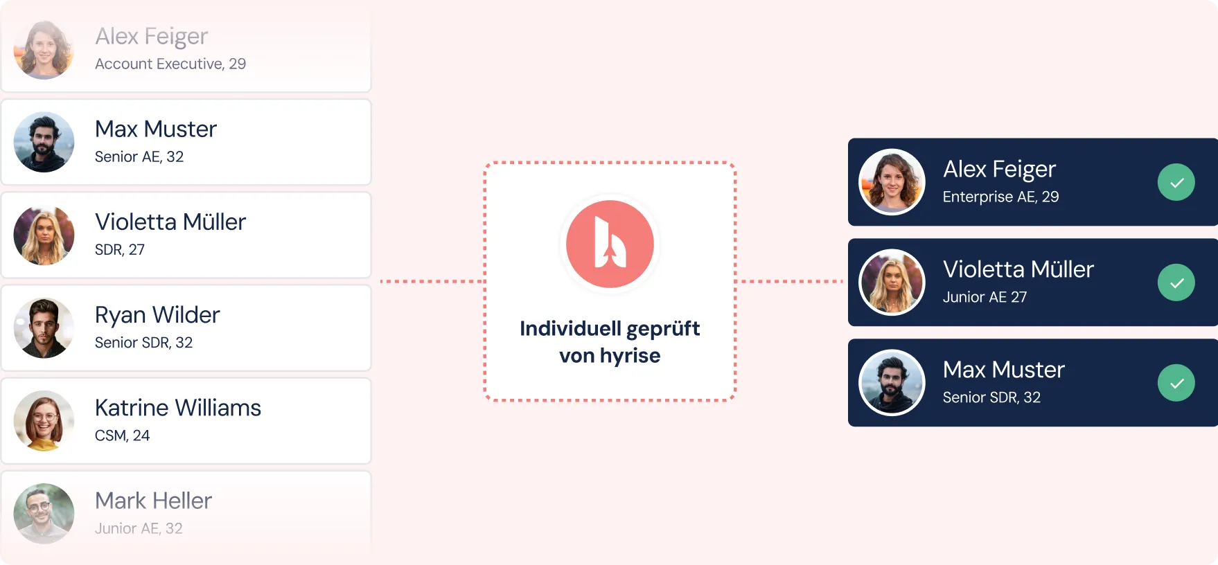 Über hyriseRecruiting erhalten Unternehmen Zugang zu qualifizierten SDRs, AEs und Sales Leadern aus unserem kuratierten Netzwerk von über 5.000 Tech-Sales-Professionals, jenseits klassischer Recruiting-Kanäle.